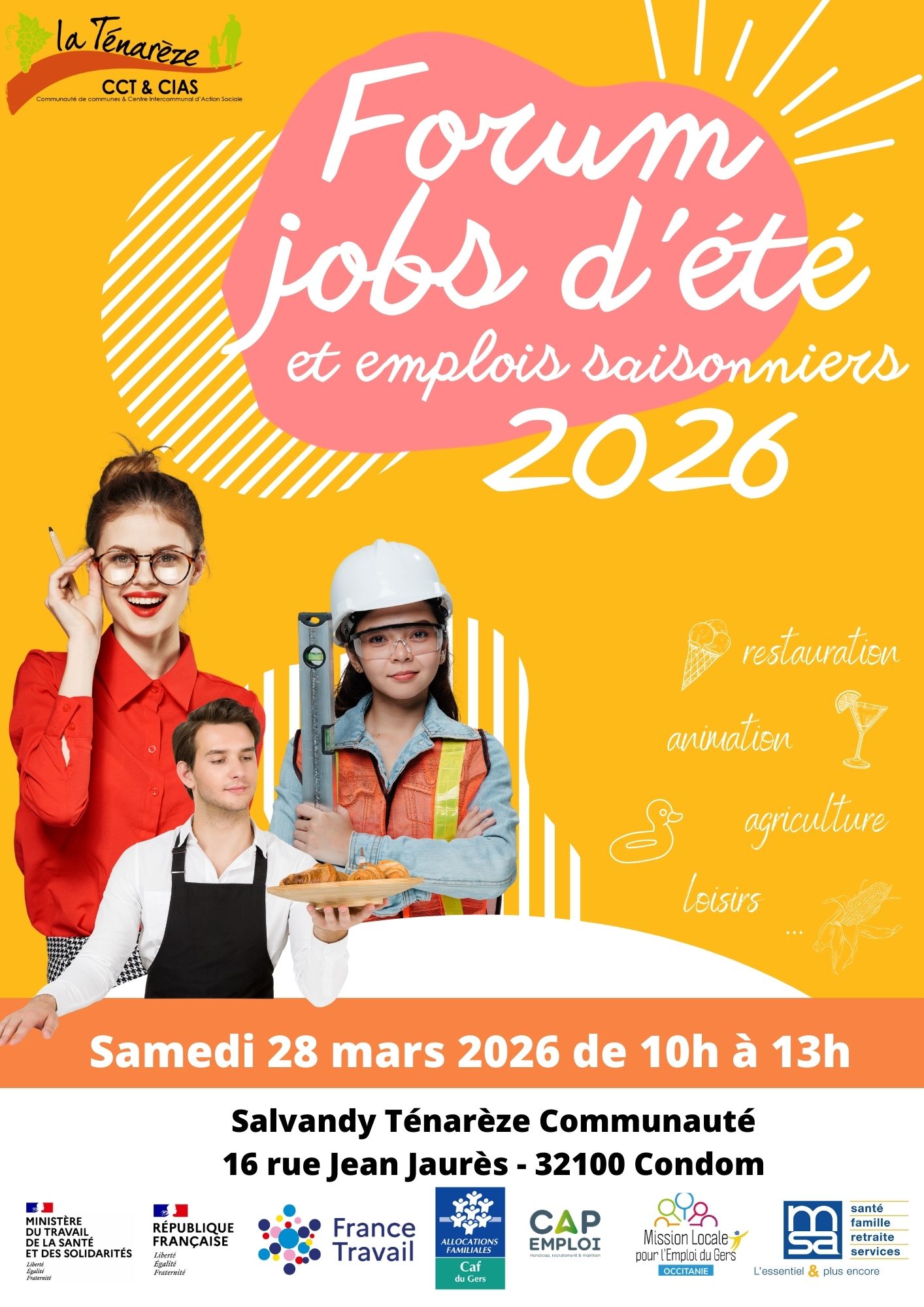 Crée le 09/03/2026Le Centre Intercommunal d’Action Sociale et la Communauté de communes de la Ténarèze donnent rendez-vous à tous les jeunes et aux entreprises du territoire pour la nouvelle édition du Forum Jobs d’Été et Emplois Saisonniers, qui se tiendra ce samedi 28 mars, de 10h à 13h à Salvandy Ténarèze Communauté, 16 rue Jean-Jaurès, à Condom.